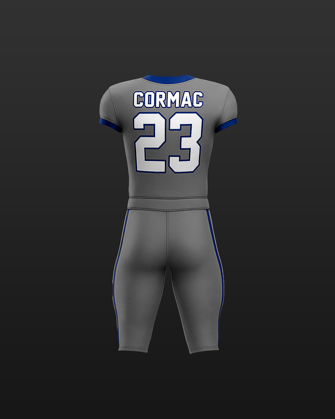 - Command the field with a uniform that’s as sharp as your game. Our Steel Blue Football Uniform is a complete set featuring a solid gray base with bold royal blue accents on the collar and shoulders. The “CORMAC” lettering is in a classic blue with a white outline, while the large number “23” stands out in white with a blue outline. The matching pants continue the clean design with two bold blue stripes down the sides. Engineered for the demands of the game, this uniform provides superior durability, flexibility, and comfort.